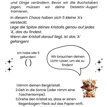 💎 Lernen mit Licht: Der echte Bergkristall (oder eine Taschenlampe) dient als "Licht-Laser", um Buchstaben zu finden und zu fokussieren.